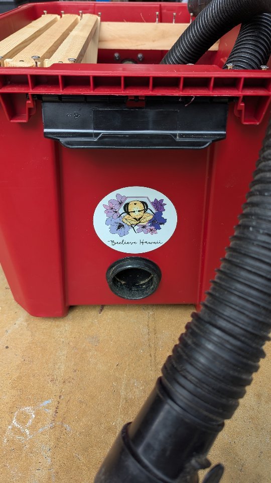 After a month of dusting cobwebs and refurbishing old beekeeping equipment, another gift was bestowed upon us. Laurent Pool of Waimea Valley donated a swarm that he captured in one of their botanical gardens. A year later… skylights and clear corrugated roof panels were installed by carpenter, Dick Shearer, so the bees could have more sun exposure. His sweet wife, Amy, helped us finish the project with a fresh paint job. Our biggest hive named, DNA (a pun on Dick & Amy’s initials), is kept in honor of their devoted volunteer service.